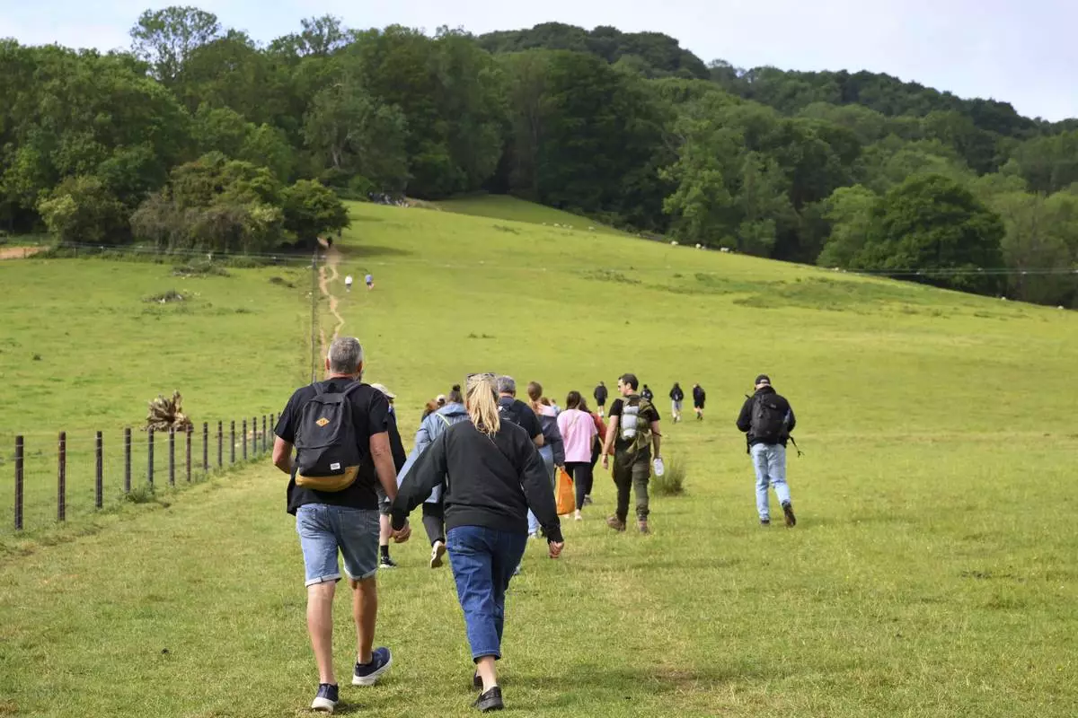 Spectators walk up Cooper's Hill to watch the traditional annual Cheese Rolling contest at in Brockworth, Gloucestershire, England, Monday, May 26, 2025.(AP Photo/Anthony Upton)