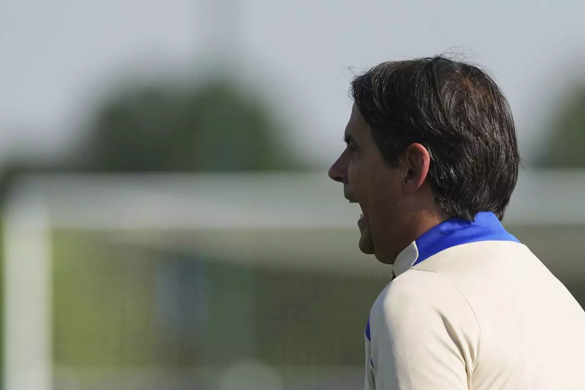 Inter Milan's head coach Simone Inzaghi shouts during a training session of the Champions League Media Day in view of the Saturday's Champions League final against PSG, at the Inter Milan training center, in Appiano Gentile, Italy, Monday, May. 26, 2025. (AP Photo/Antonio Calanni)