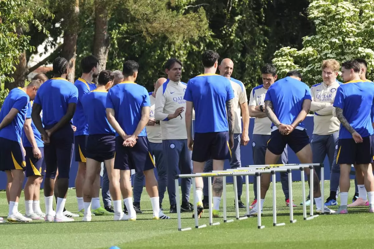 Inter Milan players gather with their head coach Simone Inzaghi during a training session of the Champions League Media Day in view of the Saturday's Champions League final against PSG, at the Inter Milan training center, in Appiano Gentile, Italy, Monday, May 26, 2025. (AP Photo/Antonio Calanni)
