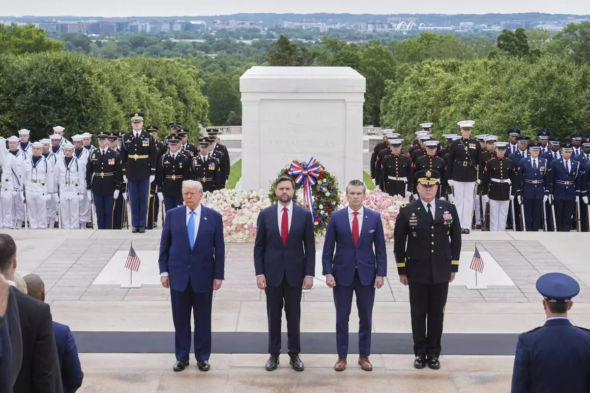 President Donald Trump, Vice President JD Vance, Secretary of Defense Pete Hegseth and Major General Trevor Bredenkamp, commanding general of the Joint Task Force-National Capital Region and the U.S. Army Military District of Washington, right, attend a Memorial Day wreath laying ceremony at Arlington National Cemetery, in Arlington, Va., Monday, May 26, 2025. (AP Photo/Jacquelyn Martin)