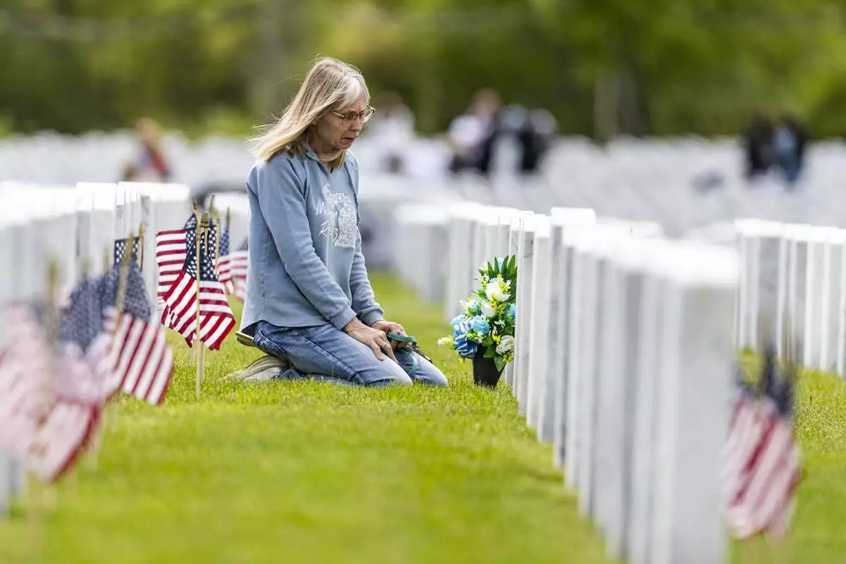 Stacey Buc visits the headstone of her mom, Felicia Buc, and dad, Tech. Chester Buc, after a Memorial Day ceremony on Sunday, May 25, 2025, at Great Lakes National Cemetery in Holly Township, Mich. (Ayrton Breckenridge/The Flint Journal via AP)