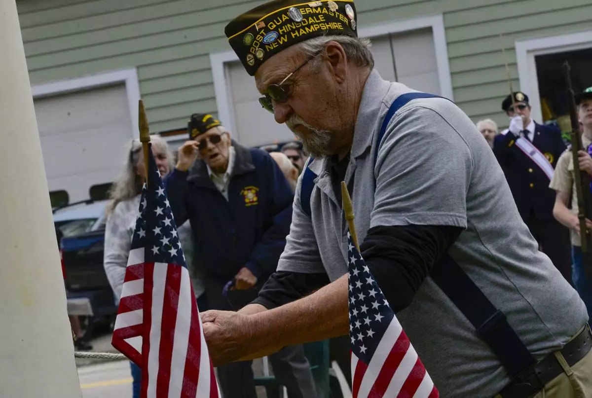 Doug Stephens of Hinsdale, N.H., raises the American flag at the V.F.W. in Hinsdale during the annual Memorial Day parade on Monday, May 26, 2025. (Kristopher Radder/The Brattleboro Reformer via AP)
