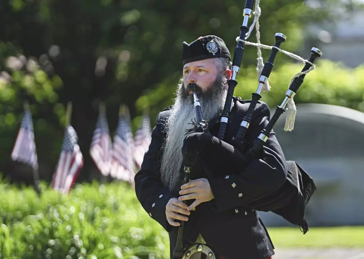 Bagpiper Timothy Gatehouse participates in an annual Memorial Day observance at Sandyvale Cemetery in Johnstown, Pa., Monday, May 26, 2025. (John Rucosky/The Tribune-Democrat via AP)