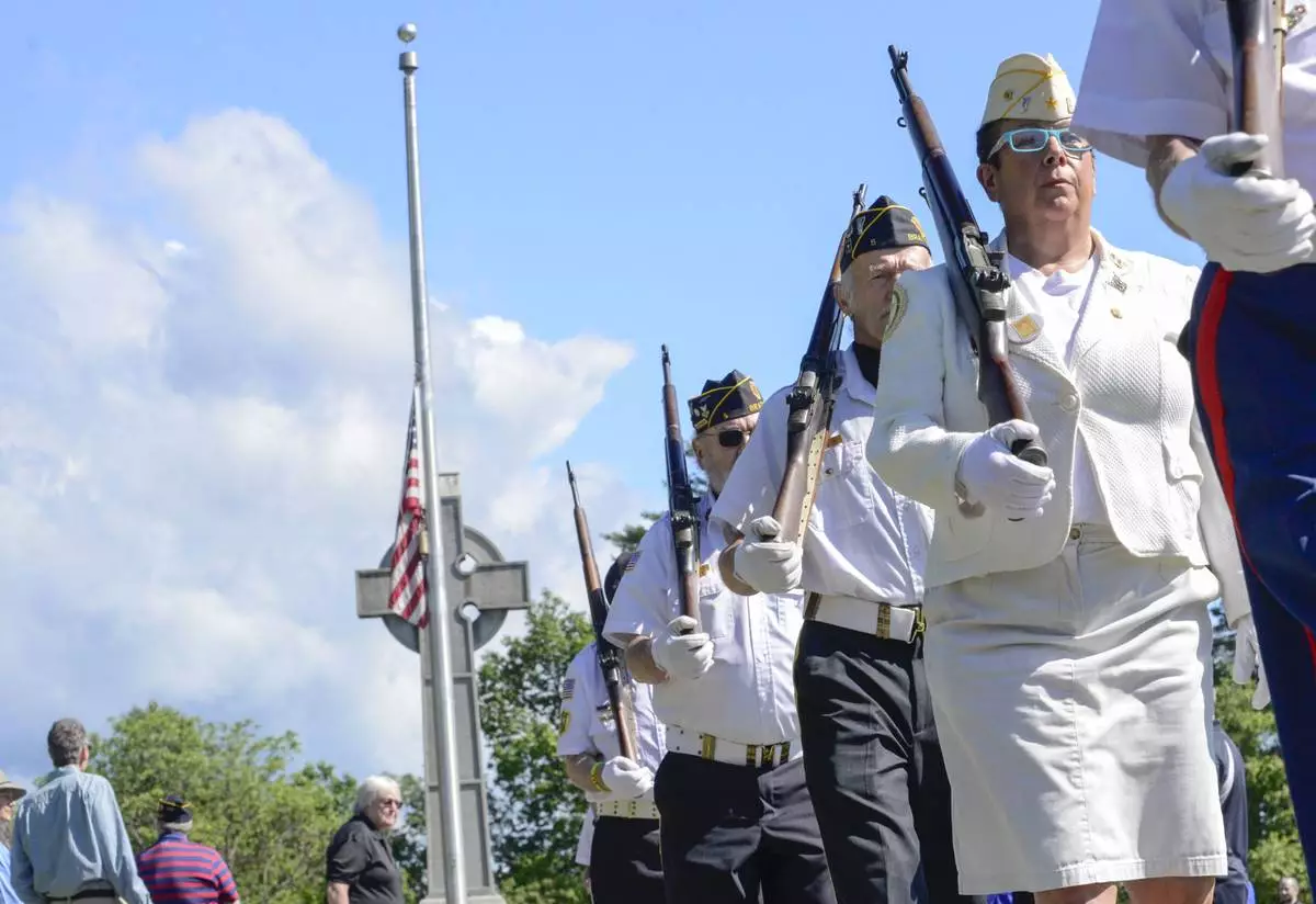 Gold Star Mother Regina Meckle joins the American Legion Color Guard as they visit memorials and cemeteries in Brattleboro, Vt., on Monday, May 26, 2025, on Memorial Day to honor the lives of soldiers who have died. (Kristopher Radder/The Brattleboro Reformer via AP)