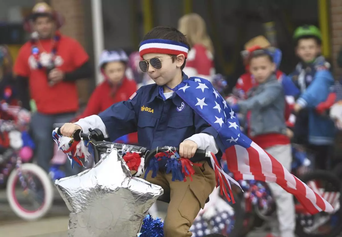 Leigton Pearce, 8, of Westmont participates in a Memorial Day bicycle contest in Johnstown, Pa., Monday, May 26, 2025. (John Rucosky/The Tribune-Democrat via AP)