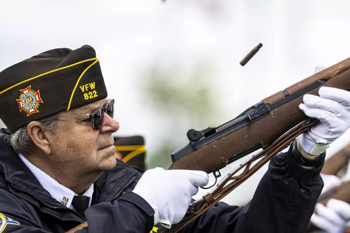 A member of the VFW Post 822 Flint Honor Guard Team completes a rifle salute during a Memorial Day ceremony on Sunday, May 25, 2025, at Great Lakes National Cemetery in Holly Township, Mich. (Ayrton Breckenridge/The Flint Journal via AP)