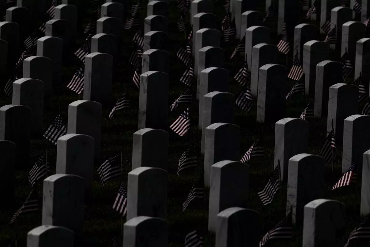 American flags sit in front of headstones before a Memorial Day ceremony on Sunday, May 25, 2025, at Great Lakes National Cemetery in Holly Township, Mich. (Ayrton Breckenridge/The Flint Journal via AP)