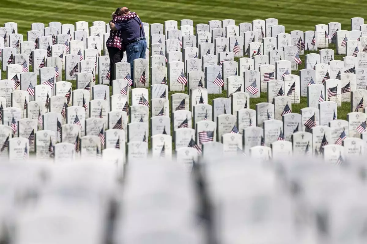 People hug after visiting a loved one before a Memorial Day ceremony on Sunday, May 25, 2025, at Great Lakes National Cemetery in Holly Township, Mich. (Ayrton Breckenridge/The Flint Journal via AP)