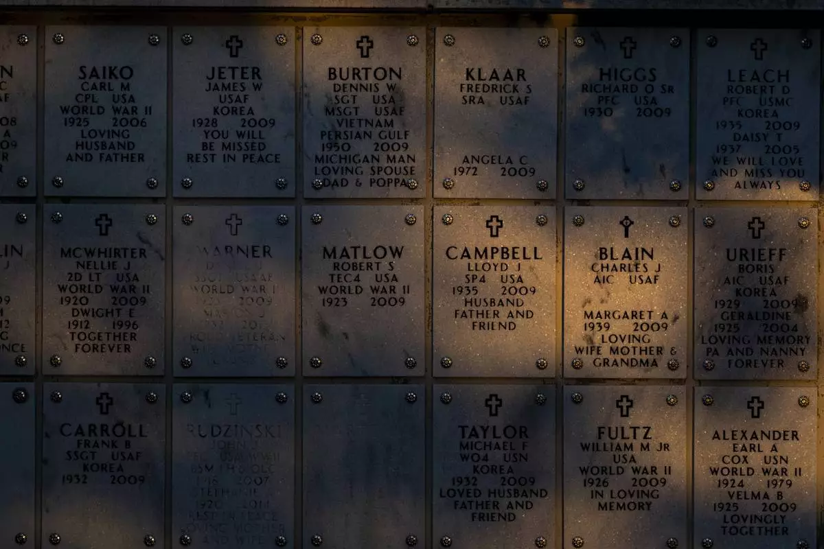 The sun spills over a memorial wall during Memorial Day on Monday, May 26, 2025, at Great Lakes National Cemetery in Holly Township, Mich. (Ayrton Breckenridge/The Flint Journal via AP)
