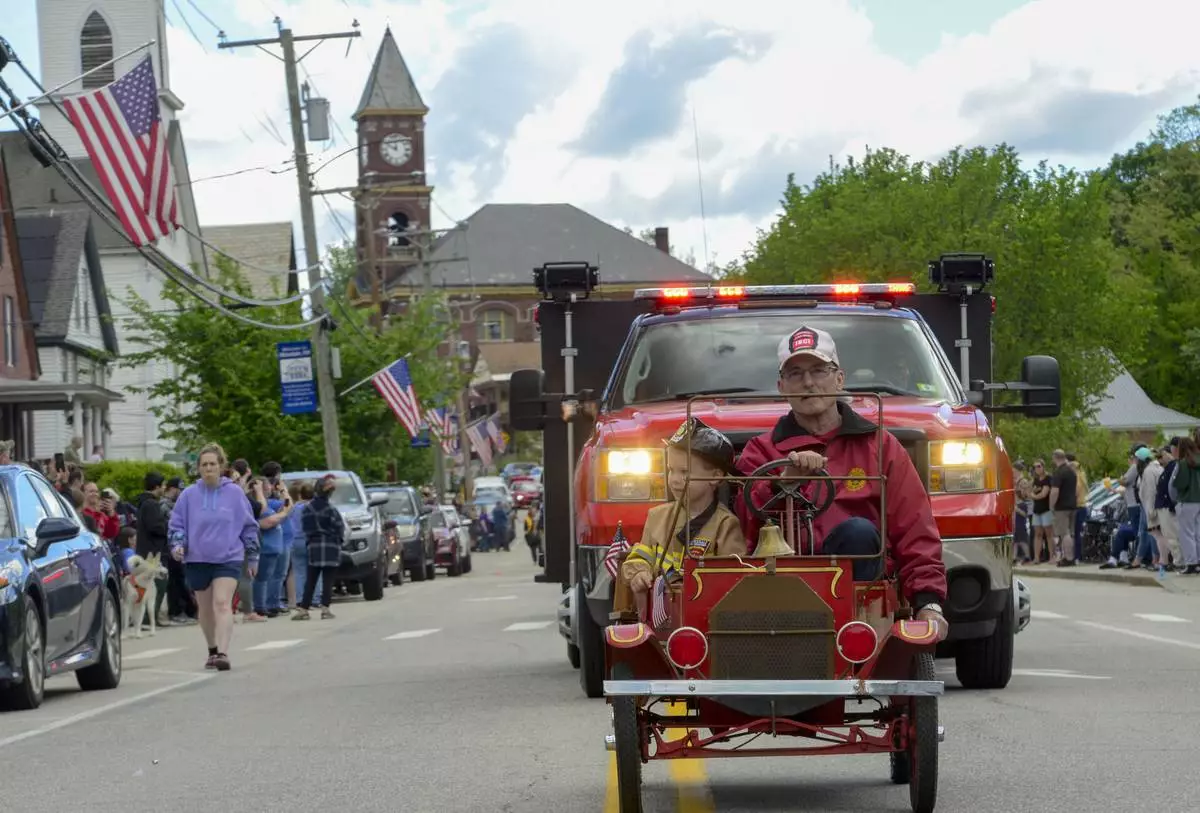 Bob Johnson, retired fire chief for Hinsdale, N.H., drives a small fire truck with his 3-year-old grandchild, Nick Pelis, during the annual Memorial Day parade on Monday, May 26, 2025. (Kristopher Radder/The Brattleboro Reformer via AP)