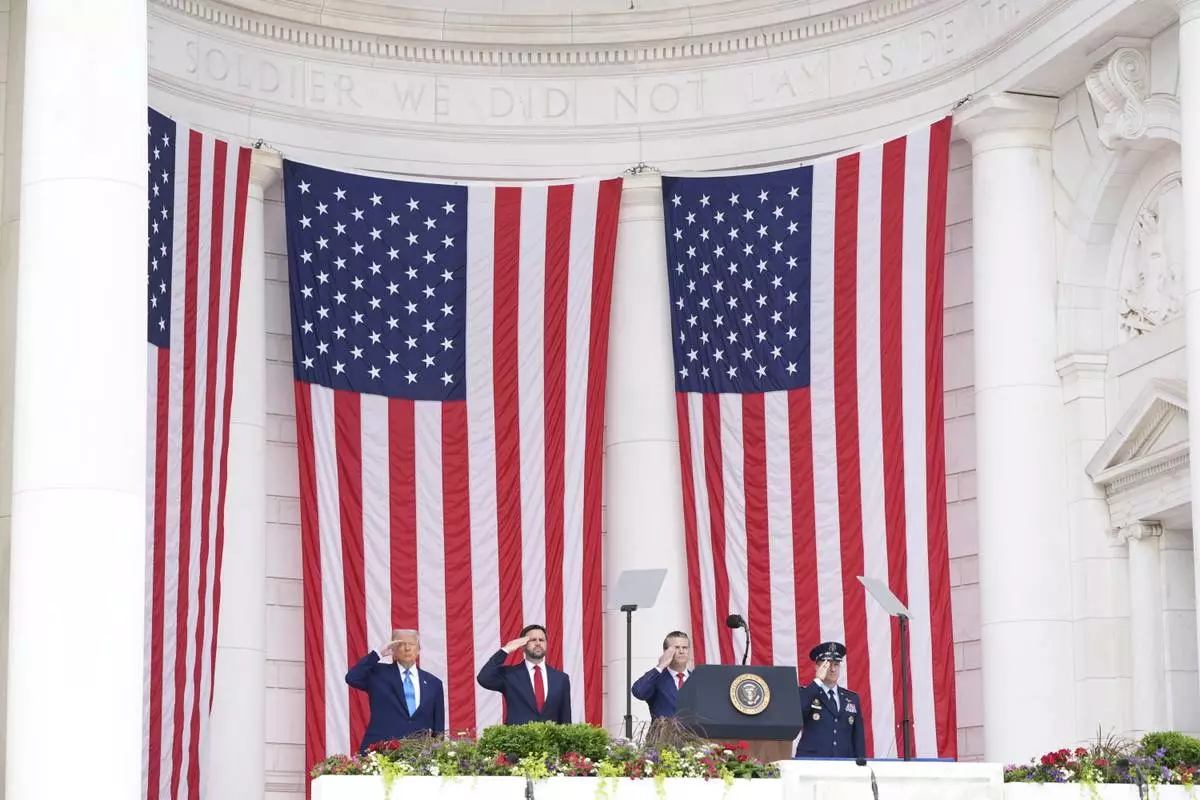 President Donald Trump, from left, Vice President JD Vance, Secretary of Defense Pete Hegseth and Chairman of the Joint Chiefs of Staff, U.S. Air Force Gen. Dan Caine, right, salute during the 157th National Memorial Day Observance at Arlington National Cemetery, Monday, May 26, 2025, in Arlington, Va. (AP Photo/Jacquelyn Martin)