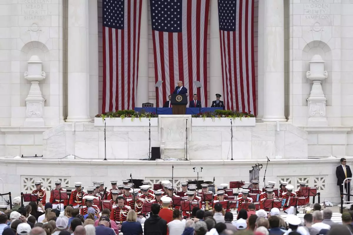 President Donald Trump delivers the Memorial Day Address at the 157th National Memorial Day Observance at Arlington National Cemetery, Monday, May 26, 2025, in Arlington, Va. (AP Photo/Julia Demaree Nikhinson)