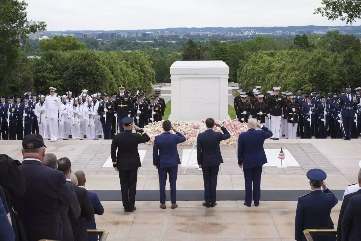 President Donald Trump, standing right, salutes at the Tomb of the Unknown Soldier, on Memorial Day at Arlington National Cemetery, in Arlington, Va., Monday, May 26, 2025. (AP Photo/Jacquelyn Martin)