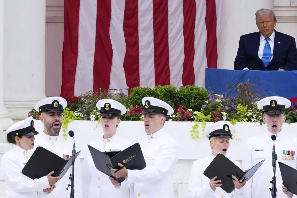 President Donald Trump listens to the U.S. Navy Sea Chanters sing, before delivering the Memorial Day Address at the 157th National Memorial Day Observance at Arlington National Cemetery, Monday, May 26, 2025, in Arlington, Va. (AP Photo/Julia Demaree Nikhinson)