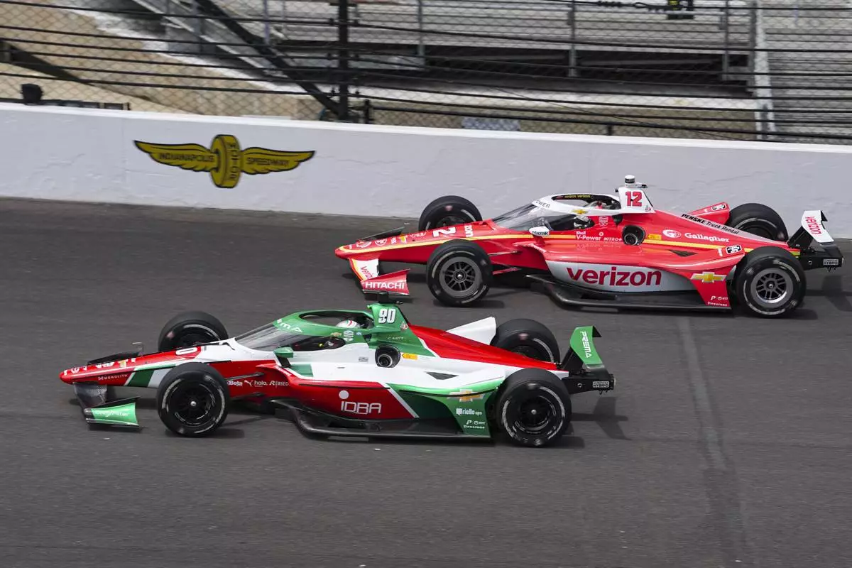 Callum Ilott, of the United Kingdom, (90) and Will Power, of Australia, drive into the first turn during practice for the Indianapolis 500 auto race at the Indianapolis Motor Speedway in Indianapolis, Monday, May 19, 2025. (AP Photo/Michael Conroy)