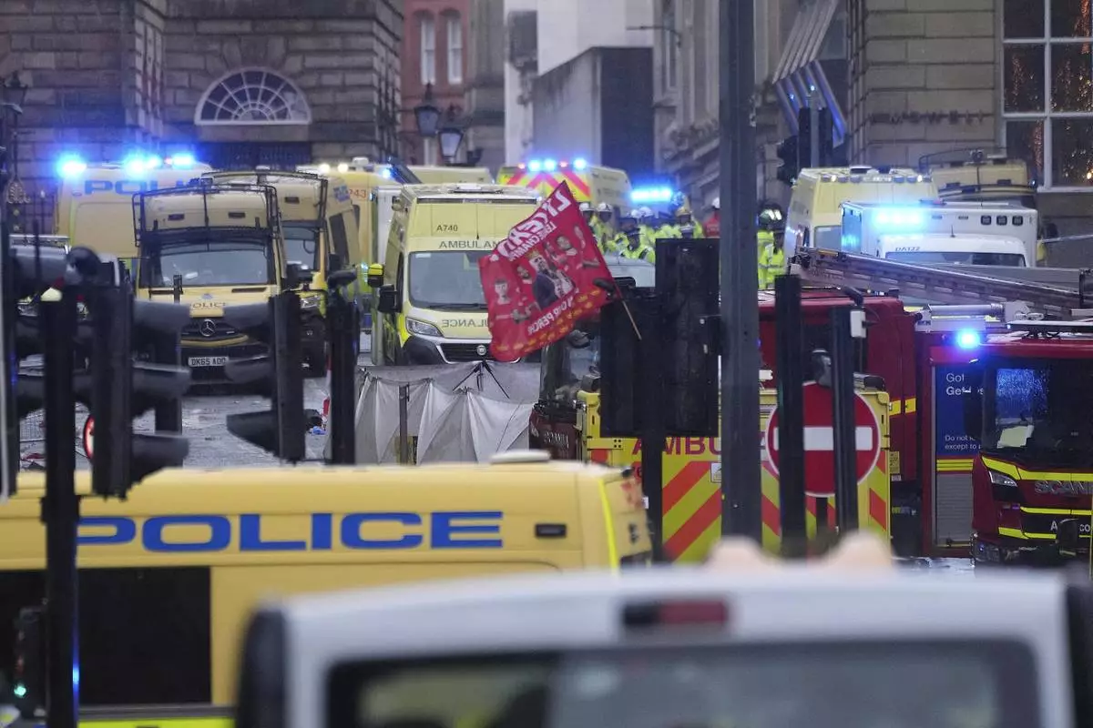 Police and emergency personnel deal with an incident after a car collided with pedestrians near the Liver Building during the Premier League winners parade in Liverpool, England, Monday, May 26, 2025.(AP Photo/Jon Super)