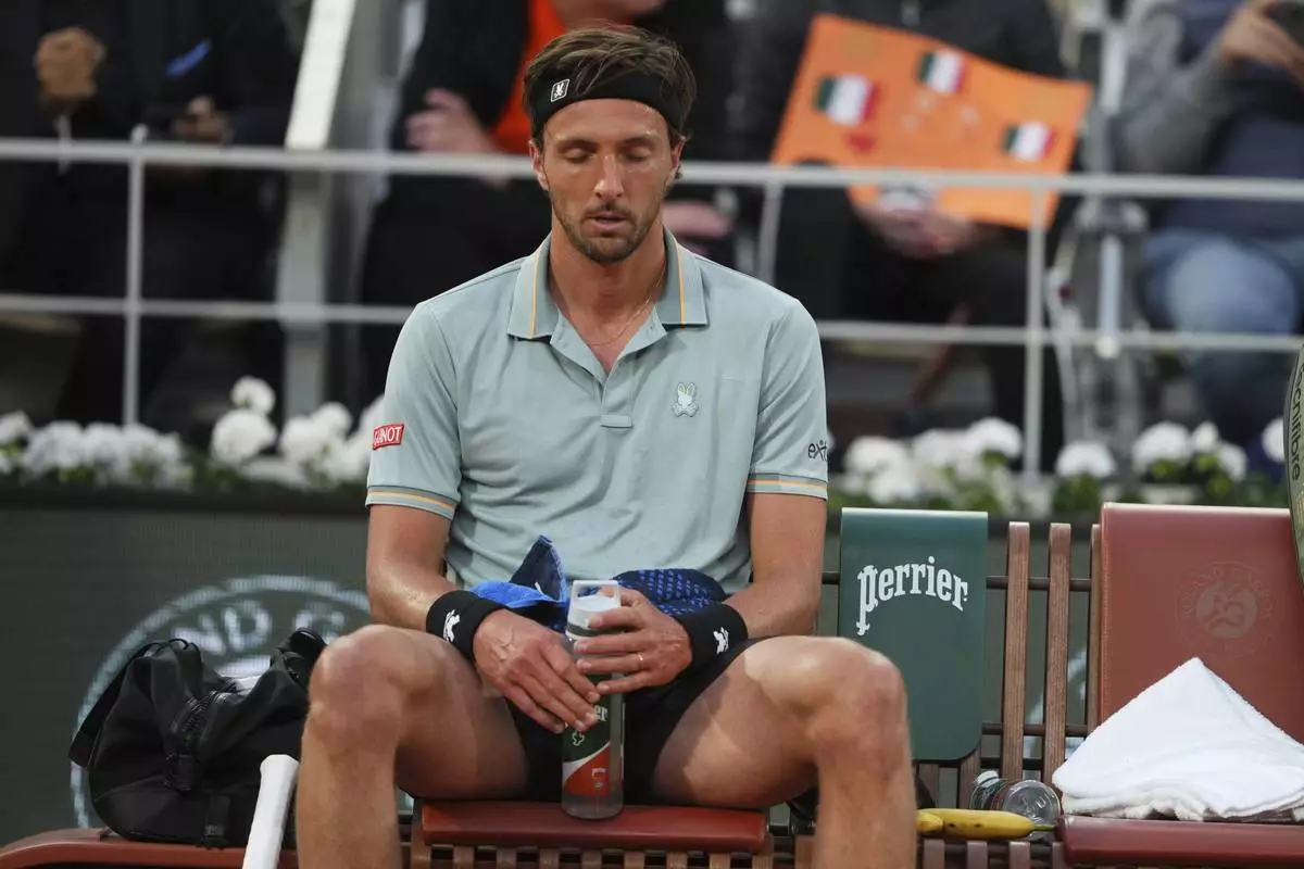 France's Arthur Rinderknech sits as he plays Italy's Jannik Sinner during their first round match of the French Tennis Open, at the Roland-Garros stadium, in Paris, Monday, May 26, 2025. (AP Photo/Lindsey Wasson)