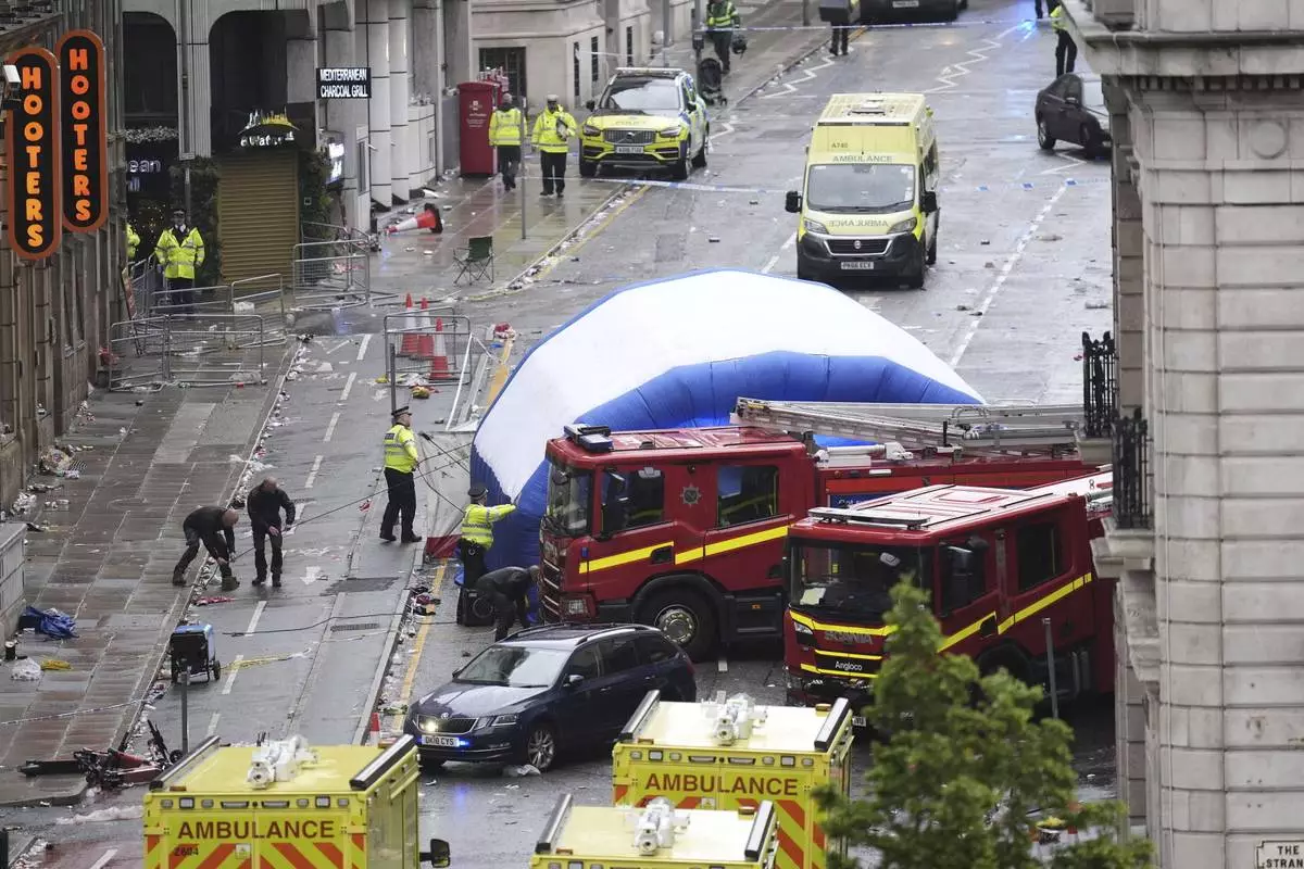 A tent is erected by police at the site of an incident on Water Street near the Liver Building in Liverpool after a car collided with pedestrians during the Premier League winners parade, in Liverpool, England, Monday May 26, 2025. (Danny Lawson/PA via AP)