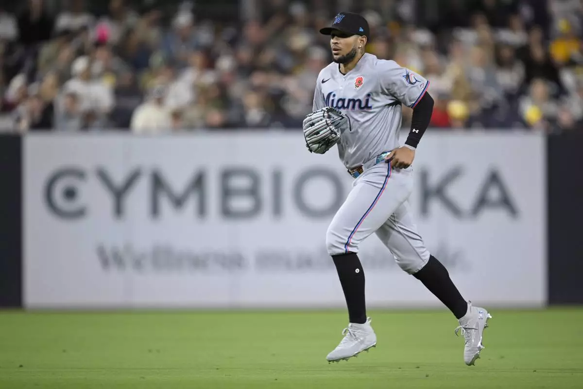 Miami Marlins center fielder Victor Mesa Jr. runs off the field during a substitution in the 11th inning of a baseball game against the San Diego Padres, Monday, May 26, 2025, in San Diego. (AP Photo/Orlando Ramirez)