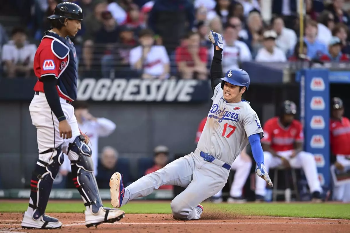 Los Angeles Dodgers' Shohei Ohtani (17) scores on an RBI single by Teoscar Hernandez (not shown) during the fifth inning of a baseball game against the Cleveland Guardians, Monday, May 26, 2025, in Cleveland. (AP Photo/David Dermer)