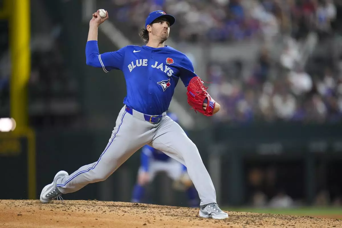 Toronto Blue Jays starting pitcher Kevin Gausman throws a pitch to the Texas Rangers during the eighth inning of a baseball game, Monday, May 26, 2025, in Arlington, Texas. (AP Photo/Julio Cortez)