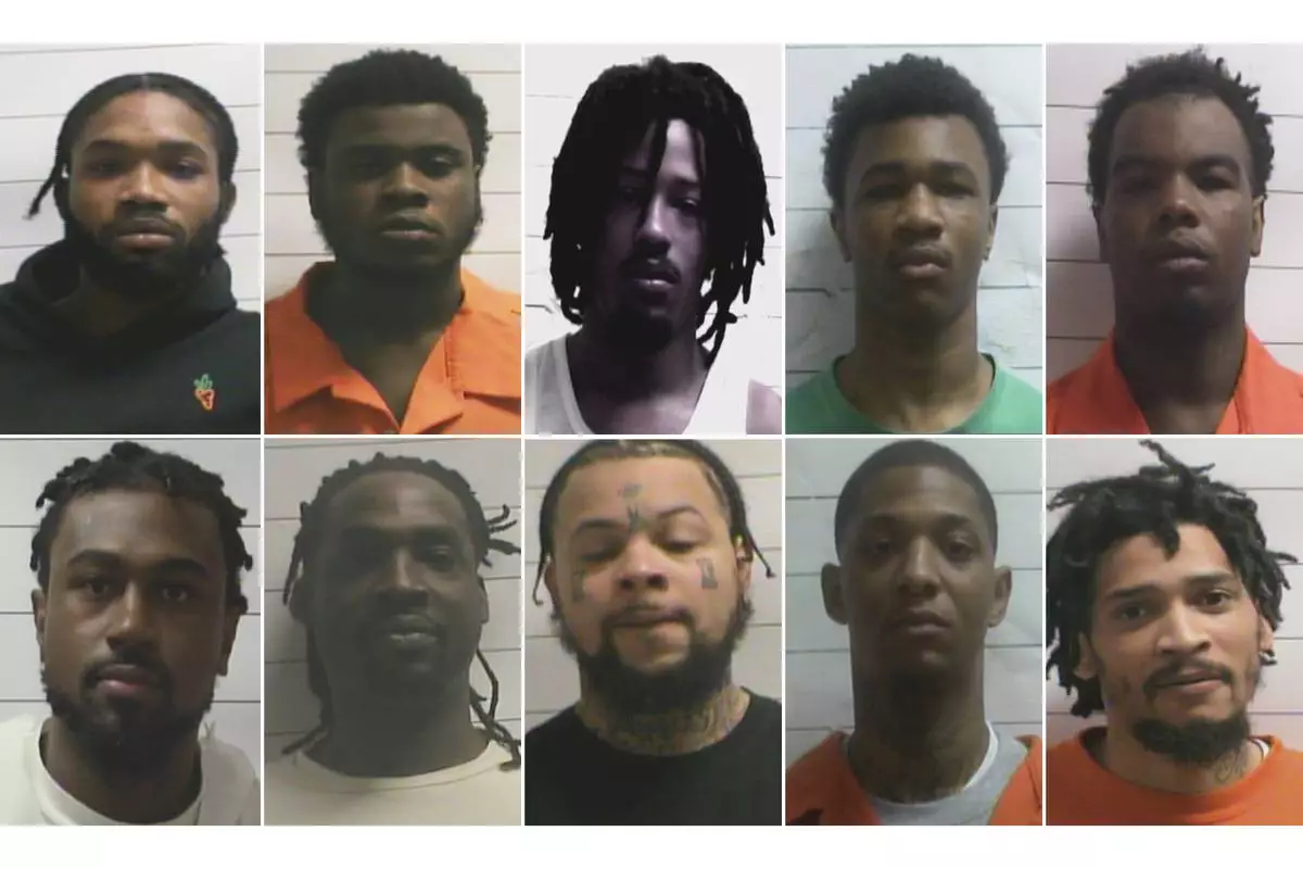 This combo from photos provided by Orleans Parish Sheriff's Office shows from left top: Dkenan Dennis, Gary C Price, Robert Moody, Kendell Myles, Corey E Boyd. Bottom from left: Lenton Vanburen Jr, Jermaine Donald, Antonine T Massey, Derrick D. Groves, and Leo Tate Sr. (Orleans Parish Sheriff's Office via AP)
