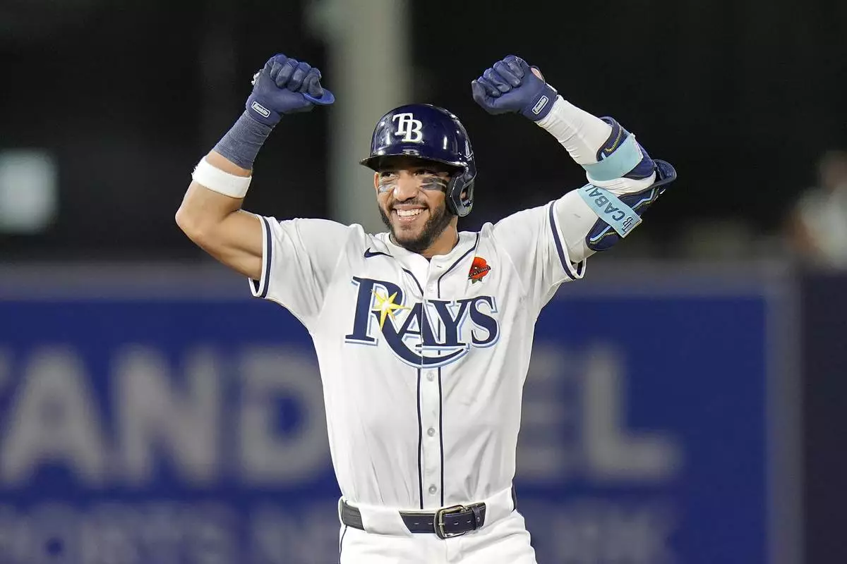 Tampa Bay Rays' José Caballero celebrates his two-run double off Minnesota Twins pitcher Kody Funderburk during the eighth inning of a baseball game Monday, May 26, 2025, in Tampa, Fla. (AP Photo/Chris O'Meara)