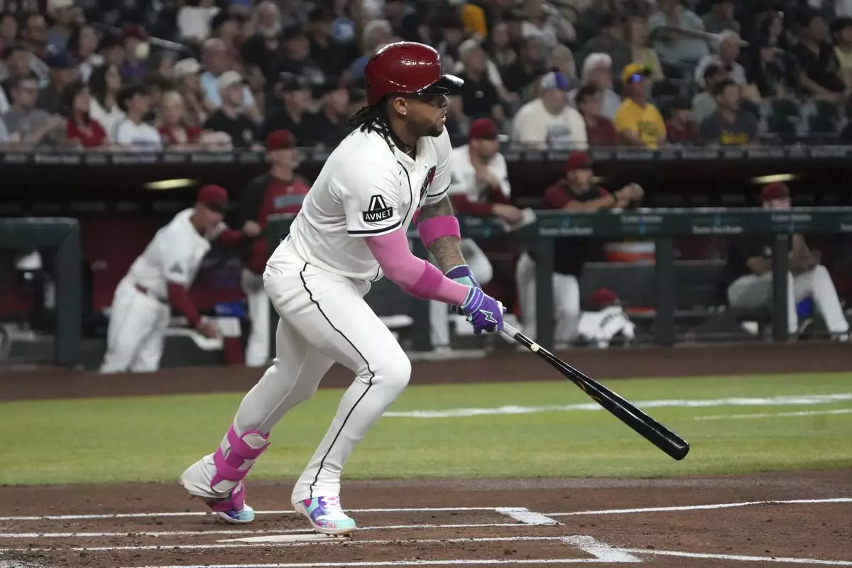 Arizona Diamondbacks' Ketel Marte hits a single against the Pittsburgh Pirates in the first inning during a baseball game, Monday, May 26, 2025, in Phoenix. (AP Photo/Rick Scuteri)