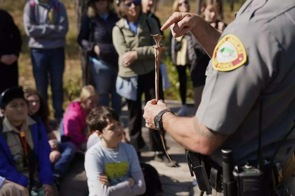 Park ranger Jesse Anderson speaks to visitors during a weekly carnivorous plant hike Saturday, March 22, 2025, in Carolina Beach, N.C. (AP Photo/Erik Verduzco)
