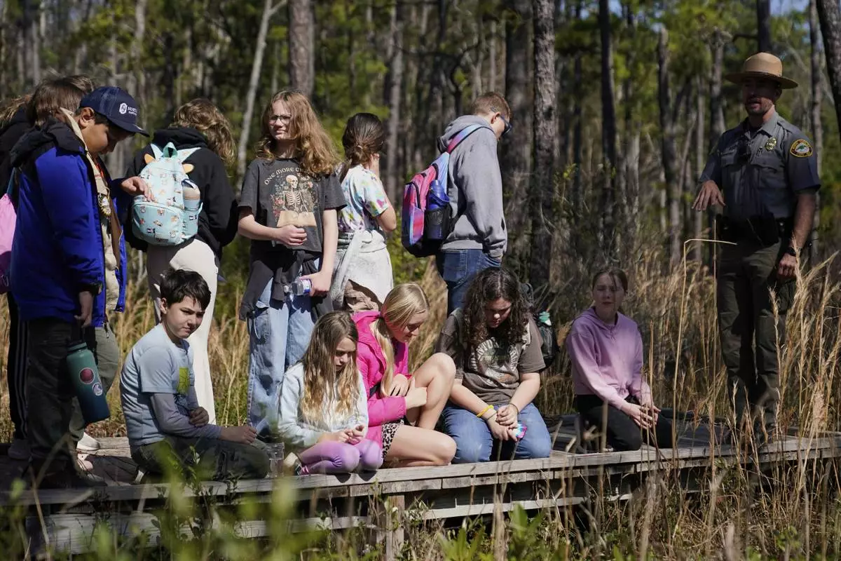Park ranger Jesse Anderson, right, speaks to visitors during a weekly carnivorous plant hike Saturday, March 22, 2025, in Carolina Beach, N.C. (AP Photo/Erik Verduzco)