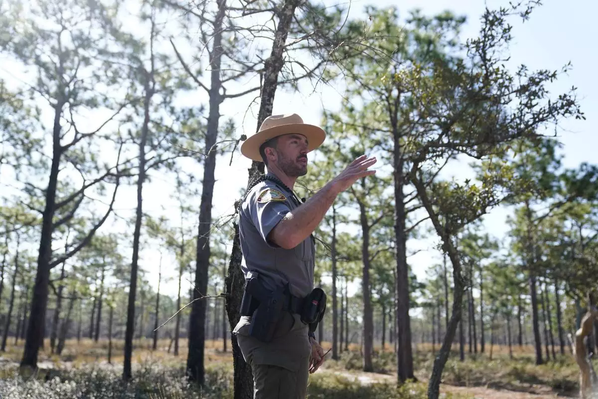 Park ranger Jesse Anderson speaks during a weekly carnivorous plant hike Saturday, March 22, 2025, in Carolina Beach, N.C. (AP Photo/Erik Verduzco)