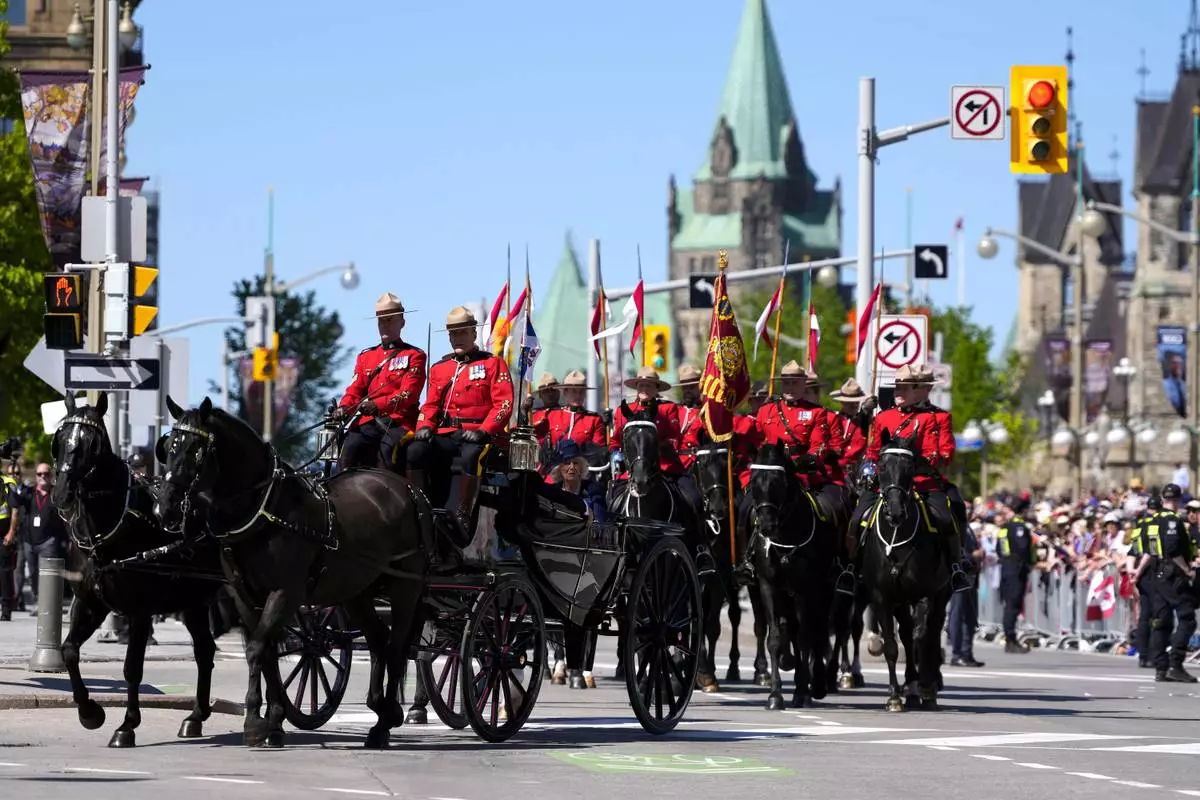 A horse-drawn carriage took Charles and Queen Camilla to the Senate of Canada Building for the speech. It was accompanied by 28 horses. After inspecting a 100-person honor guard and receiving a 21-gun salute, the king entered the building as the crowd cheered.