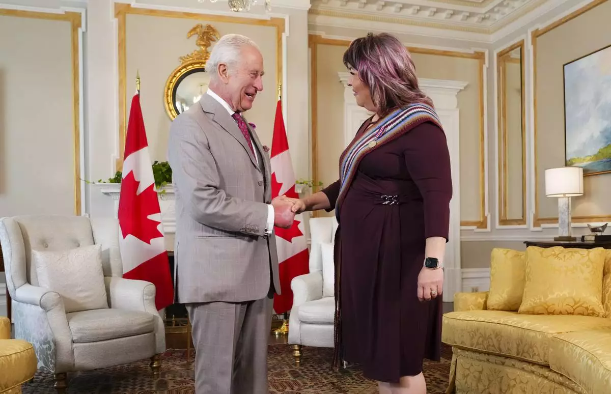 Britain's King Charles, left, meets with Métis National Council President Victoria Pruden at Rideau Hall in Ottawa, Ontario, Monday, May 26, 2025. (Sean Kilpatrick/The Canadian Press via AP)