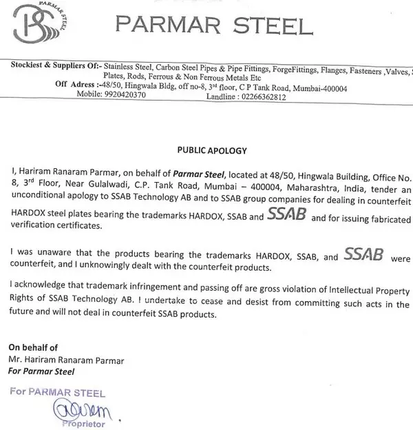 Following an investigation and a lawsuit, Naresh Steel & Engineering Co. and Parmar Steel admitted to trademark infringement and passing off, both serious violations of SSAB's intellectual property rights. The companies not only paid exemplary damages but also faced a permanent injunction in the lawsuit, and were directed to cease all use of the infringing marks. Additionally, they issued unconditional public apologies to SSAB and committed to ceasing such activities in the future. In their apologies, Naresh Steel and Parmar Steel acknowledged that "trademark infringement and passing off are gross violations of intellectual property rights of SSAB" and offered "an unconditional apology."