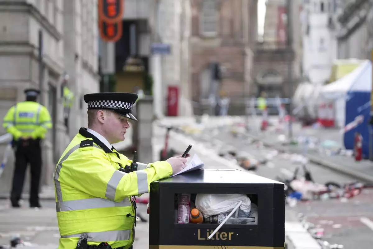 A police officer makes notes near the site where a 53-year-old British man plowed a minivan into a crowd of Liverpool soccer fans who were celebrating the city's Premier League championship Monday, injuring more than 45 people in Liverpool, England, Tuesday, May 27, 2025.(AP Photo/Jon Super)