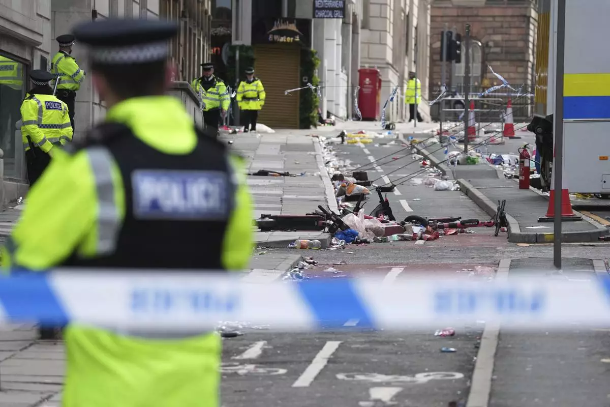 Police guards the site where a 53-year-old British man plowed a minivan into a crowd of Liverpool soccer fans who were celebrating the city's Premier League championship Monday, injuring more than 45 people in Liverpool, England, Tuesday, May 27, 2025.(AP Photo/Jon Super)