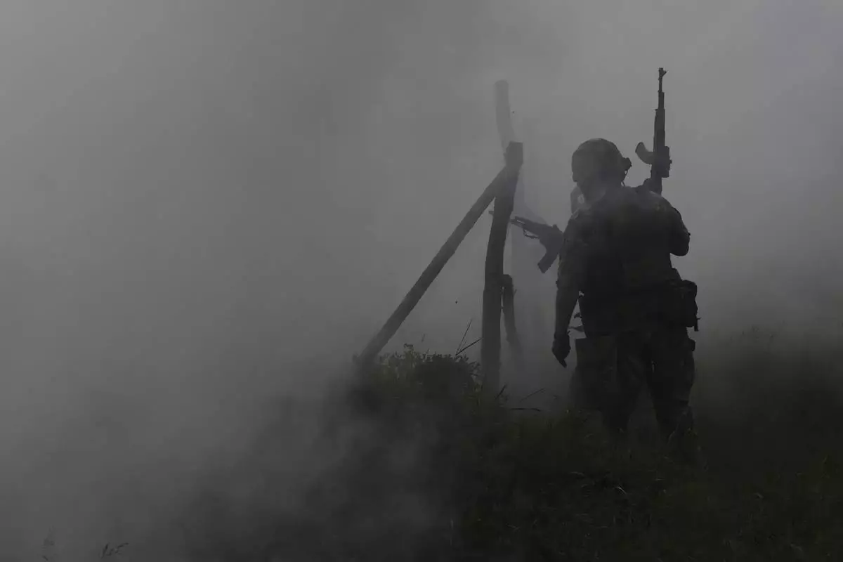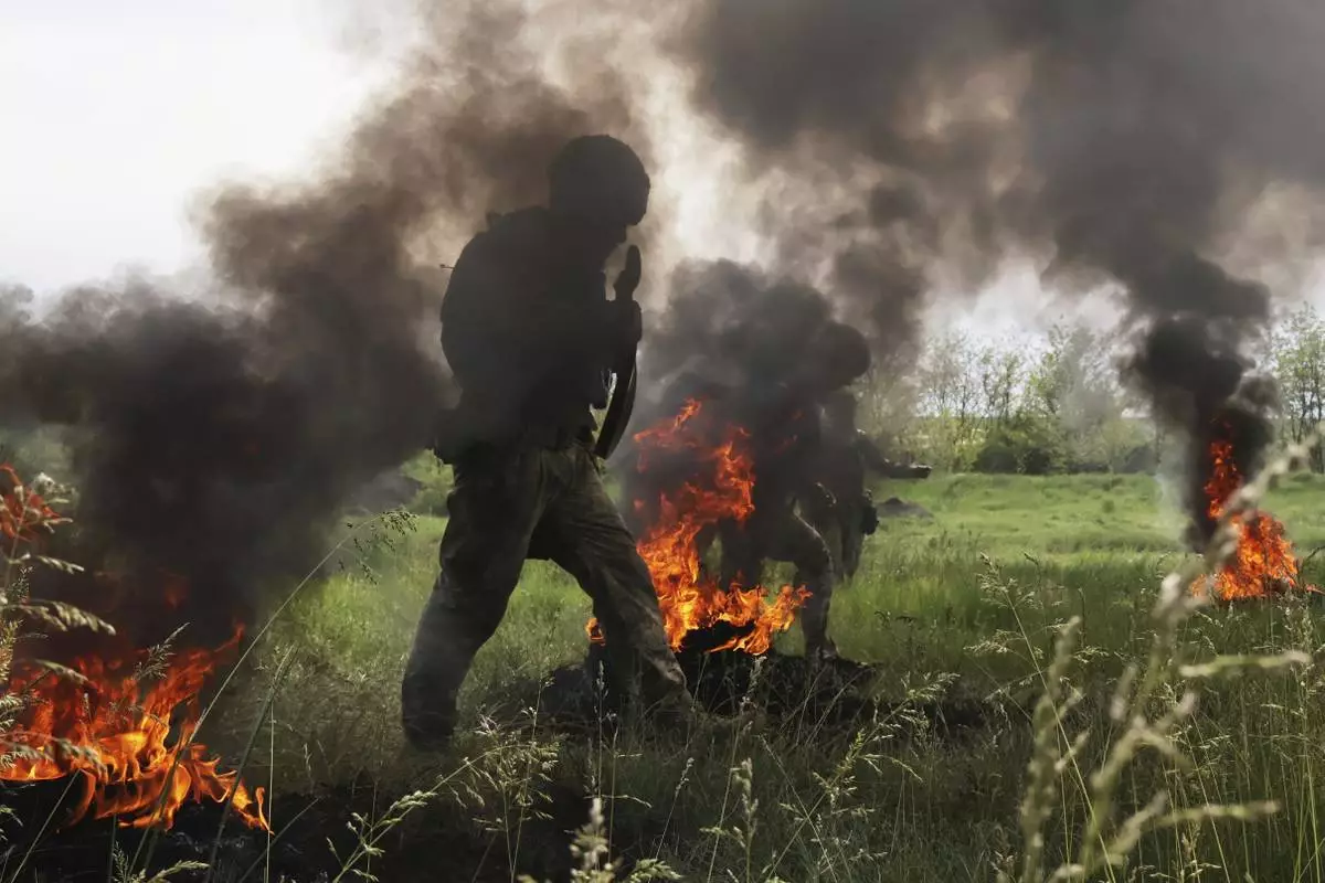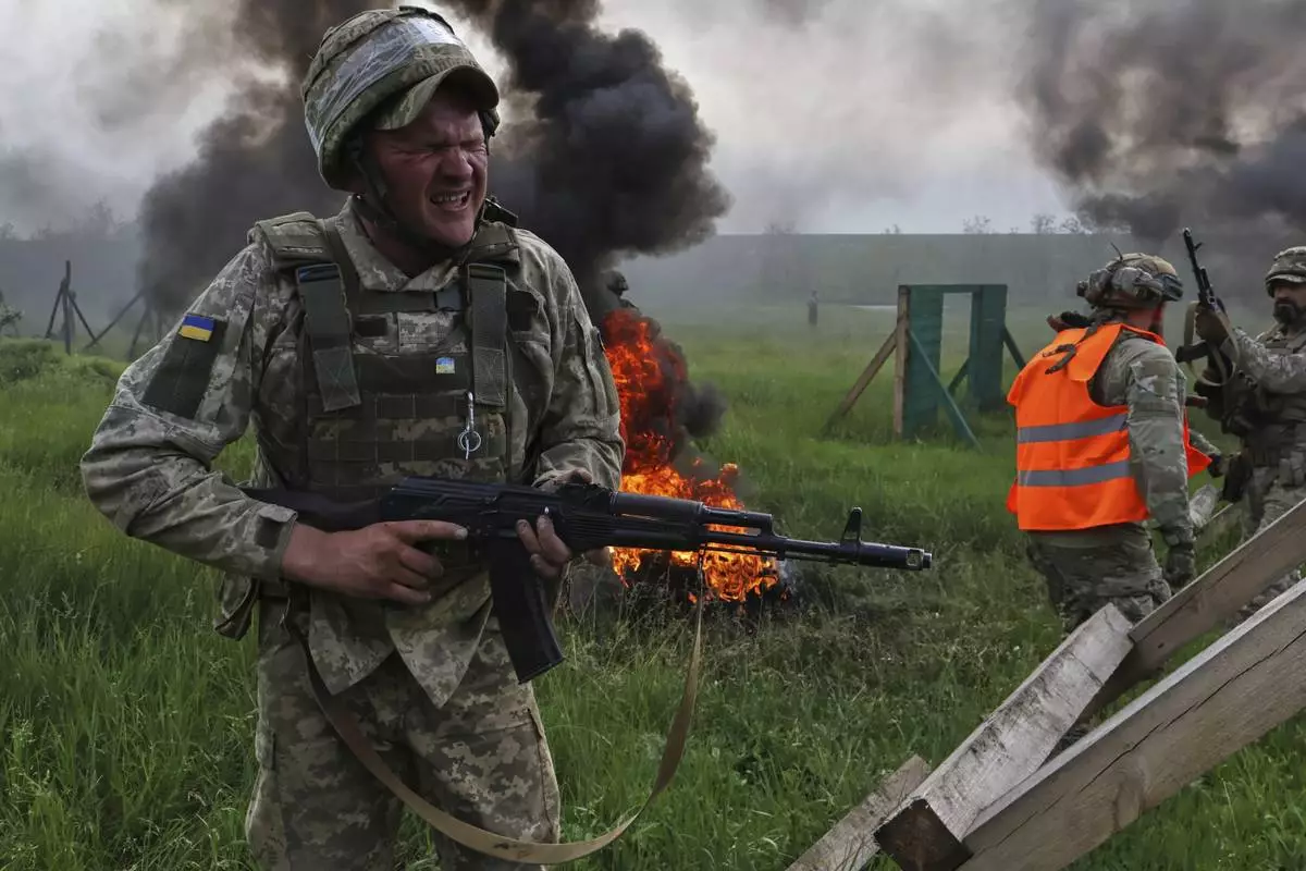 In this photo provided by Ukraine's 65th Mechanized Brigade press service, Ukrainian servicemen attend a military training in Zaporizhzhia region, Ukraine, Monday, May 26, 2025. (Andriy Andriyenko/Ukraine's 65th Mechanized Brigade via AP)