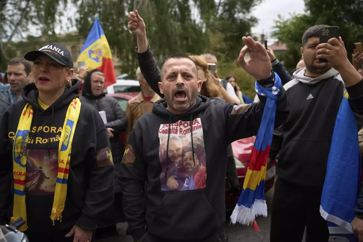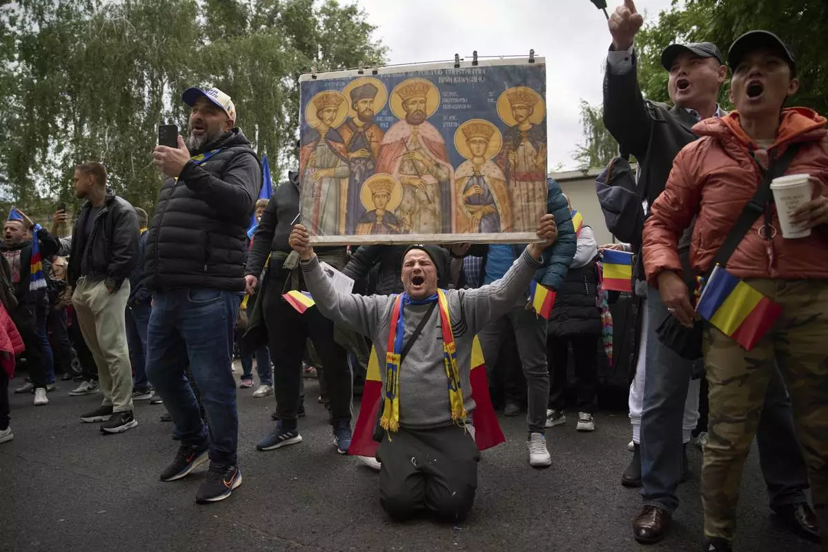 Supporters of Calin Georgescu, the winner of the first round of last year's annulled election, chant slogans during his appearance at a prosecutor's office in Bucharest, Romania, Tuesday, May 27, 2025. (AP Photo/Vadim Ghirda)