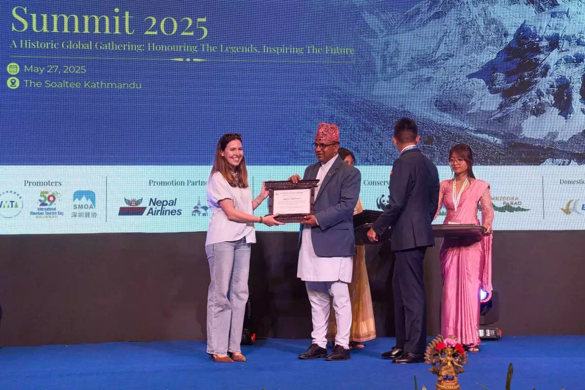 Adriana Brownlee, the youngest female to summit Mount Everest, receives an honorary certificate from Badri Prasad Pandey, Nepal's Minister for Culture, Tourism, and Civil Aviation, during the Everest Summiteers Summit in Kathmandu, Nepal, on Tuesday, May 27, 2025. (AP Photo/Niranjan Shrestha)