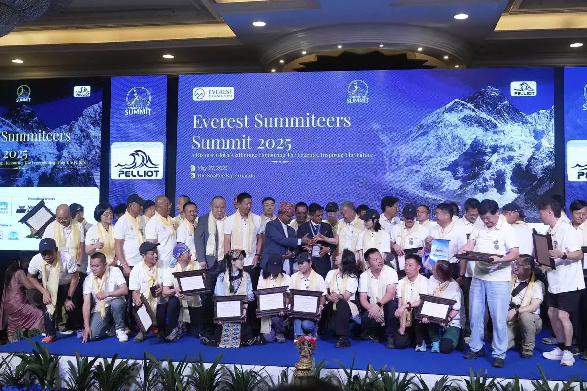 Climbers who successfully summited Mount Everest pose for a picture during the Everest Summiteers Summit in Kathmandu, Nepal, on Tuesday, May 27, 2025. (AP Photo/Niranjan Shrestha)