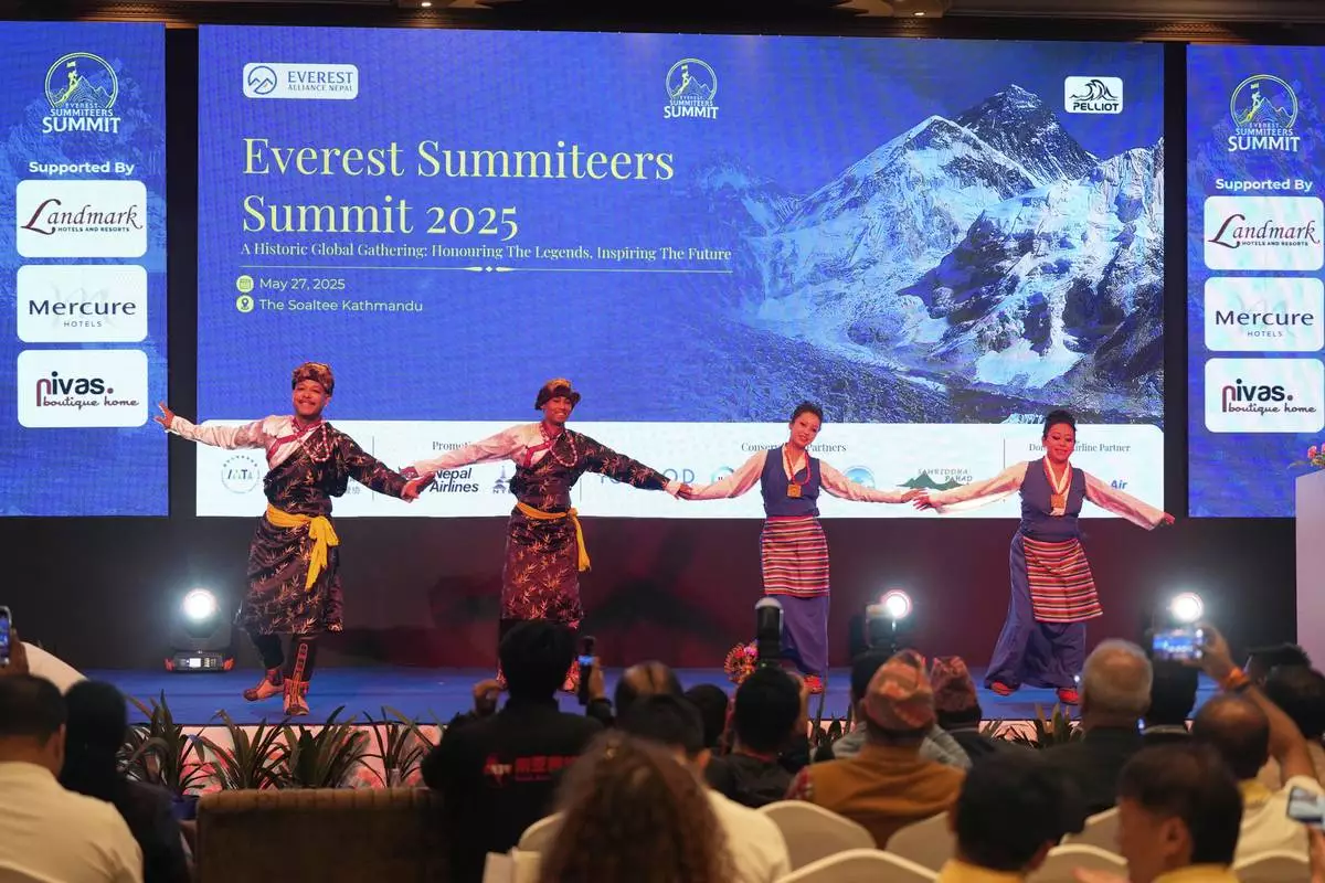 Performers wearing Sherpa attire performs traditional dance during the Everest Summiteers Summit in Kathmandu, Nepal, on Tuesday, May 27, 2025. (AP Photo/Niranjan Shrestha)