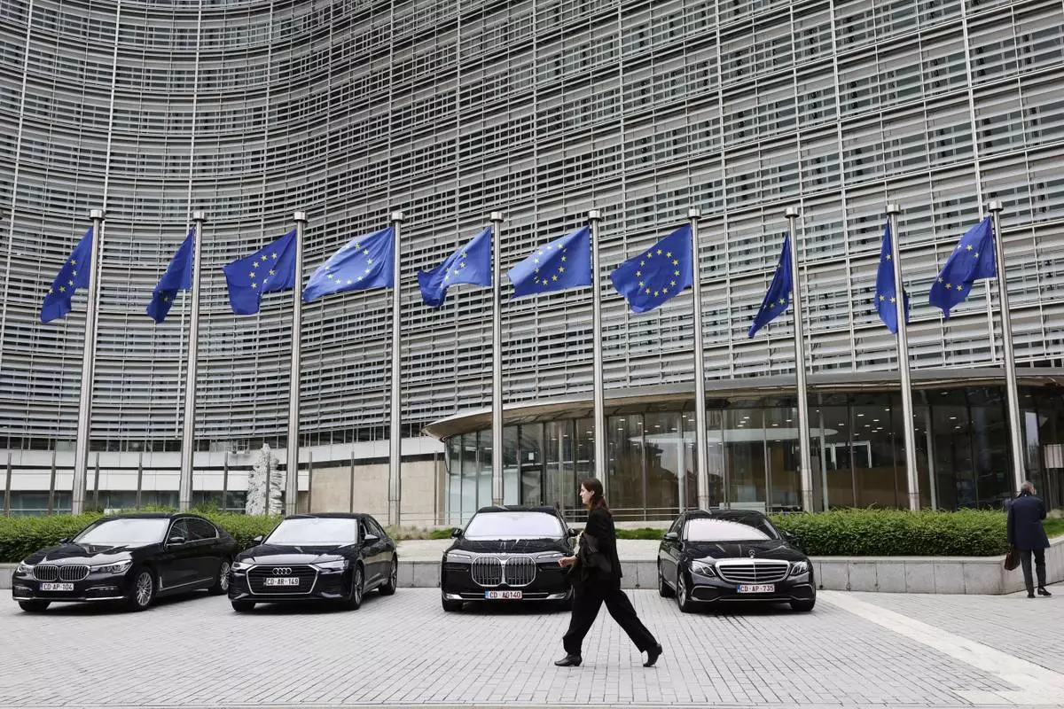European Union flags flap in the wind as a woman walks past diplomatic vehicles outside of EU headquarters in Brussels, Belgium, Tuesday, May 27, 2025. (AP Photo/Omar Havana)