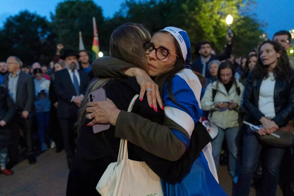 People embrace as they gather to light candles in a makeshift memorial to honor Yaron Lischinsky and Sarah Milgrim who were killed as they left an event at the Capital Jewish Museum in Washington, during a candlelight vigil outside of the White House in Washington, Thursday, May 22, 2025. (AP Photo/Jose Luis Magana)