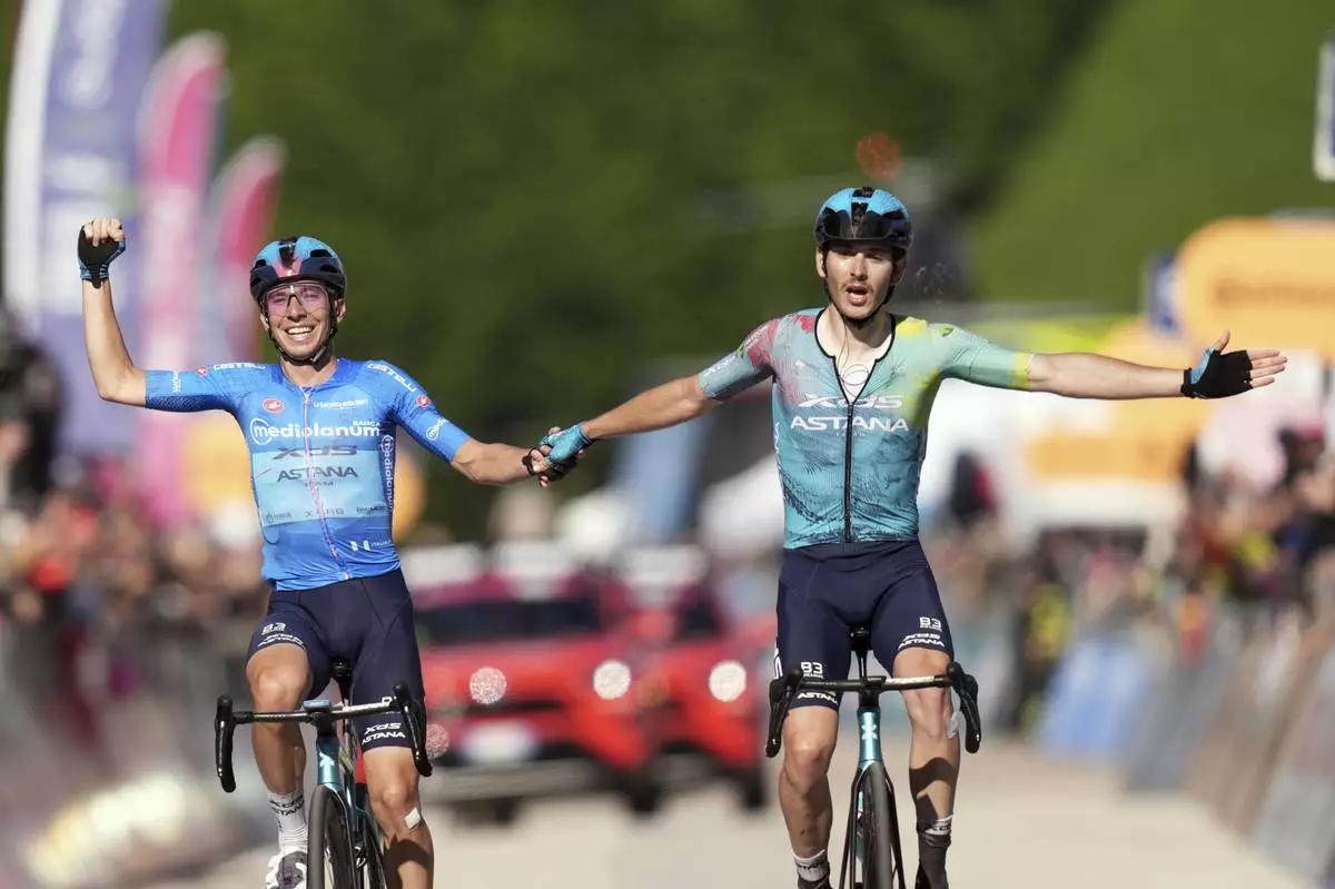 Winner of the stage Italy's Christian Scaroni of Xds Astana Team, right, and teammate Italy's Lorenzo Fortunato celebrate after crossing together the finish line during the stage 16 of the Giro d'Italia from Piazzola sul Brenta to San Valentino, Italy, Tuesday, May 27, 2025. (Massimo Paolone/LaPresse via AP)