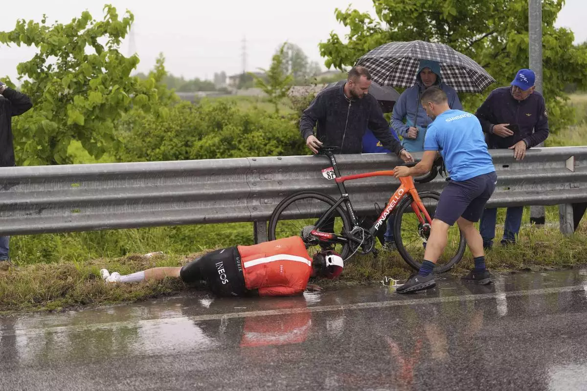 Britain's Joshua Tarling of Ineos Grenadiers lies after the fall during the stage 16 of the Giro d'Italia from Piazzola sul Brenta to San Valentino, Italy, Tuesday, May 27, 2025. (Fabio Ferrari/LaPresse via AP)