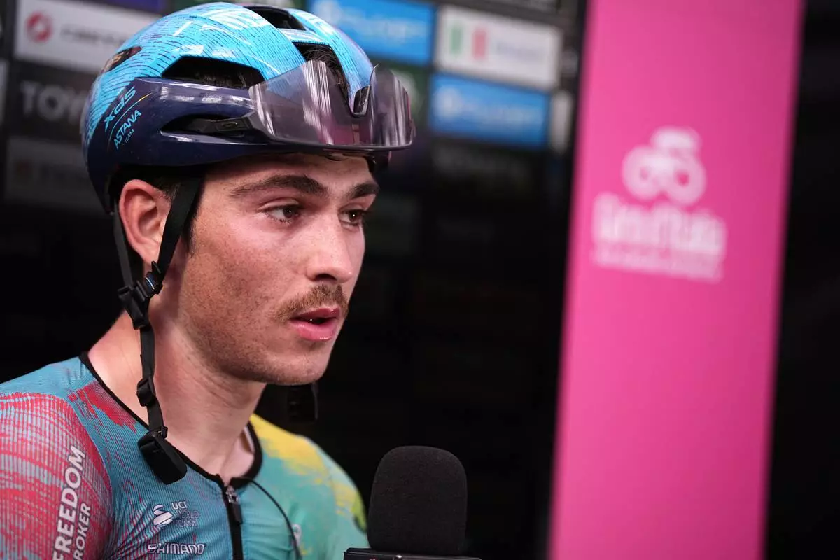 Italy's Christian Scaroni of Xds Astana Team speaks to the media after winning the stage 16 of the Giro d'Italia from Piazzola sul Brenta to San Valentino, Italy, Tuesday, May 27, 2025. (Marco Alpozzi/LaPresse via AP)