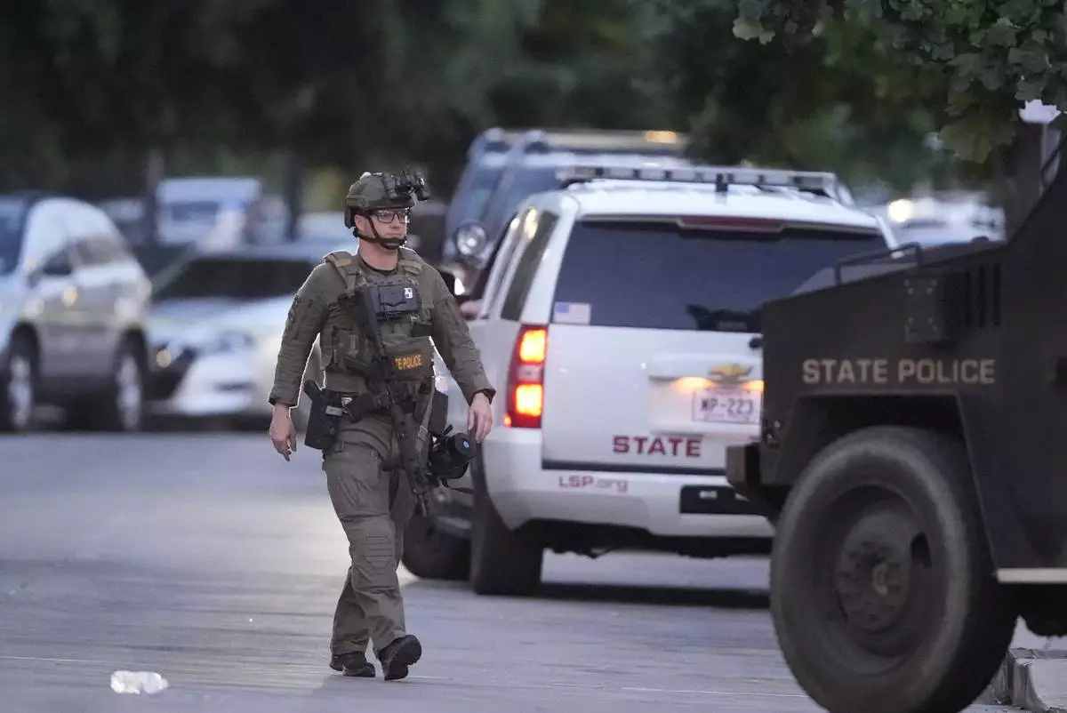 A Louisiana state police SWAT member works the scene on Iberville Street as police pursue a fugitive that escaped from a New Orleans jail, Tuesday, May 20, 2025, in New Orleans. (AP Photo/Gerald Herbert)