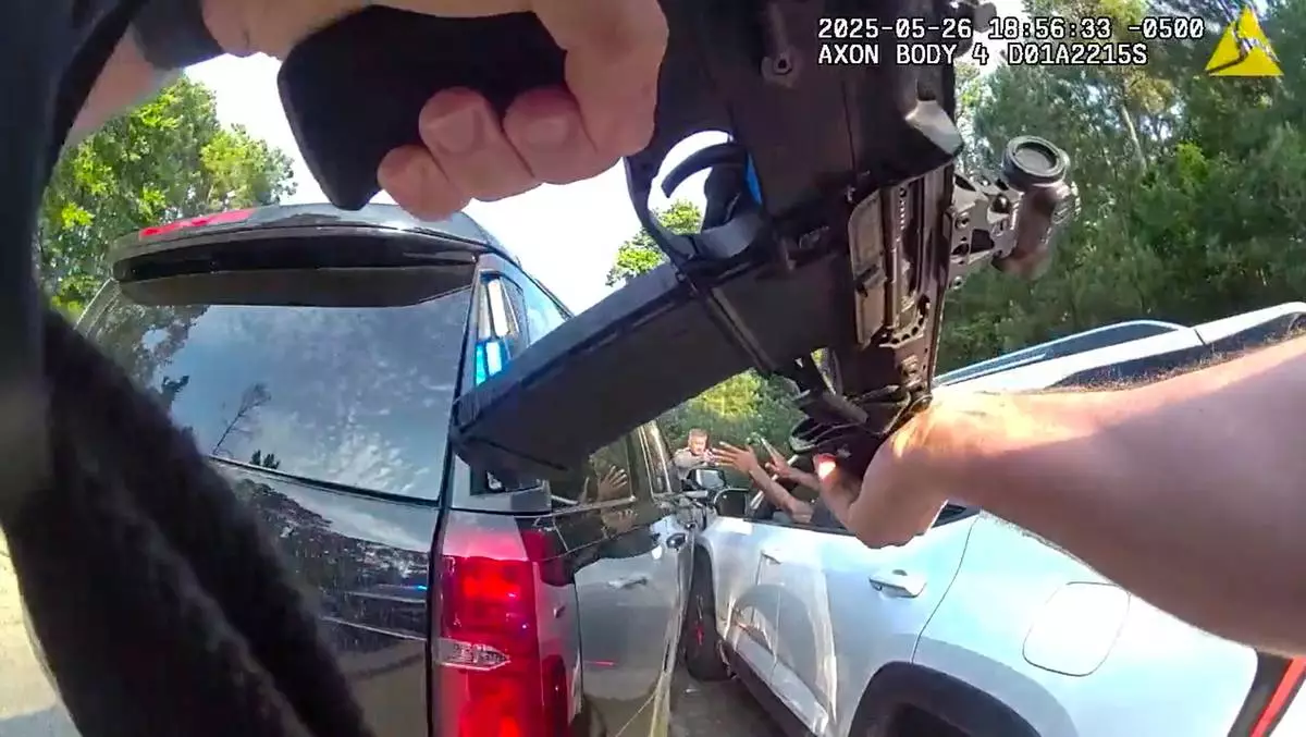 This image from video taken by Huntsville Police Department shows the May 26, 2025, arrest of two New Orleans inmates who were on the run since their May 16, 2025, jailbreak. (Huntsville Police Department via AP)