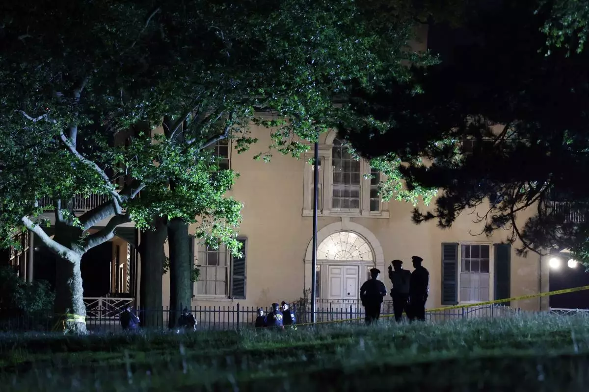 Philadelphia Police investigate the crime scene in front of Lemon Hill Mansion in the early morning hours of Tuesday, May 27, 2025. (Elizabeth Robertson/The Philadelphia Inquirer via AP)