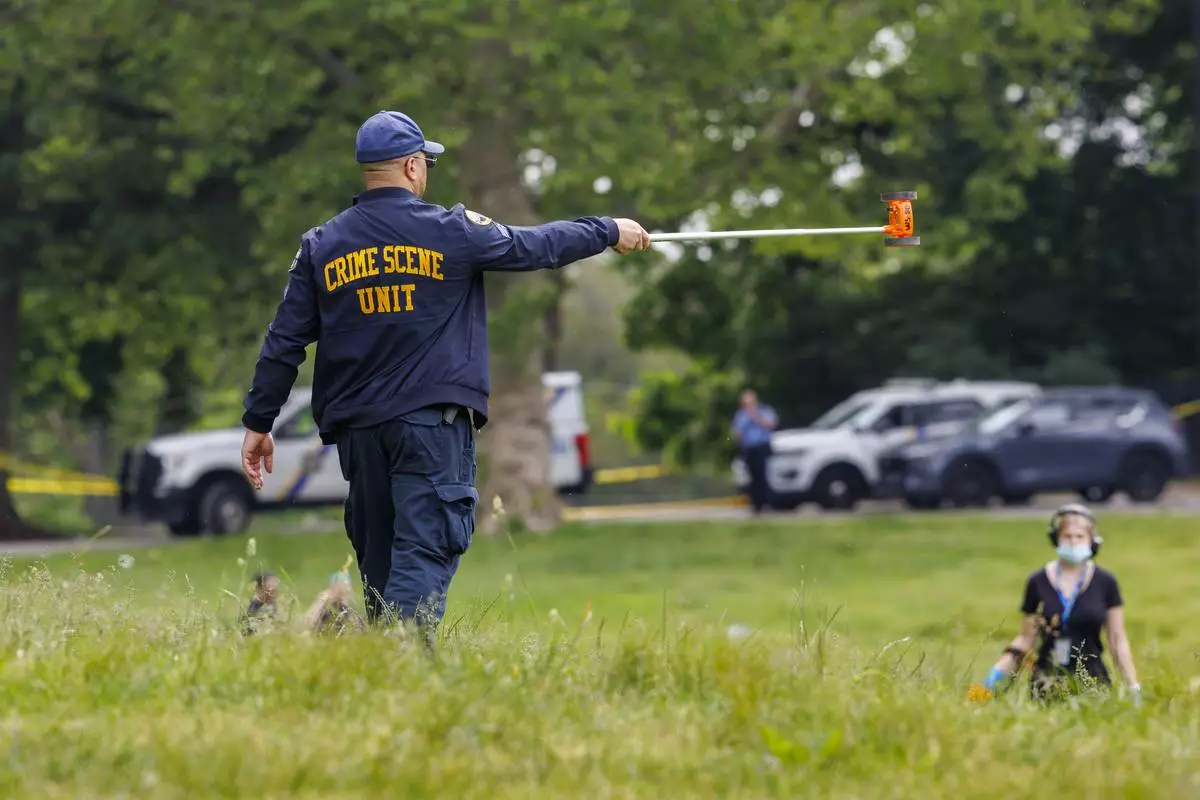 Philadelphia police Crime Scene Unit officer directs the search of people using metal detectors to search the area around the mass shooting on Lemon Hill, Tuesday, May 27, 2025. (Alejandro A Alvarez/The Philadelphia Inquirer via AP)